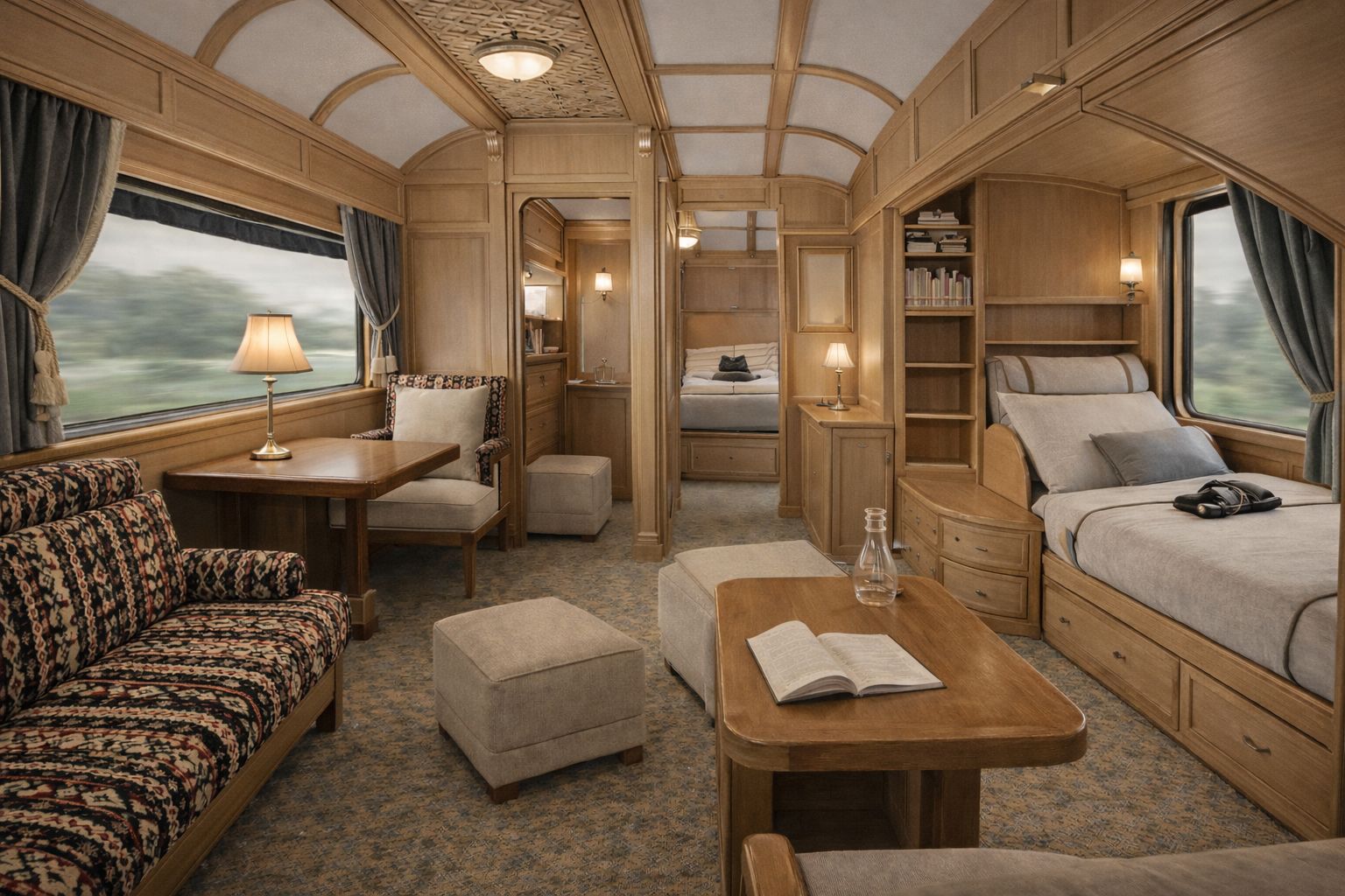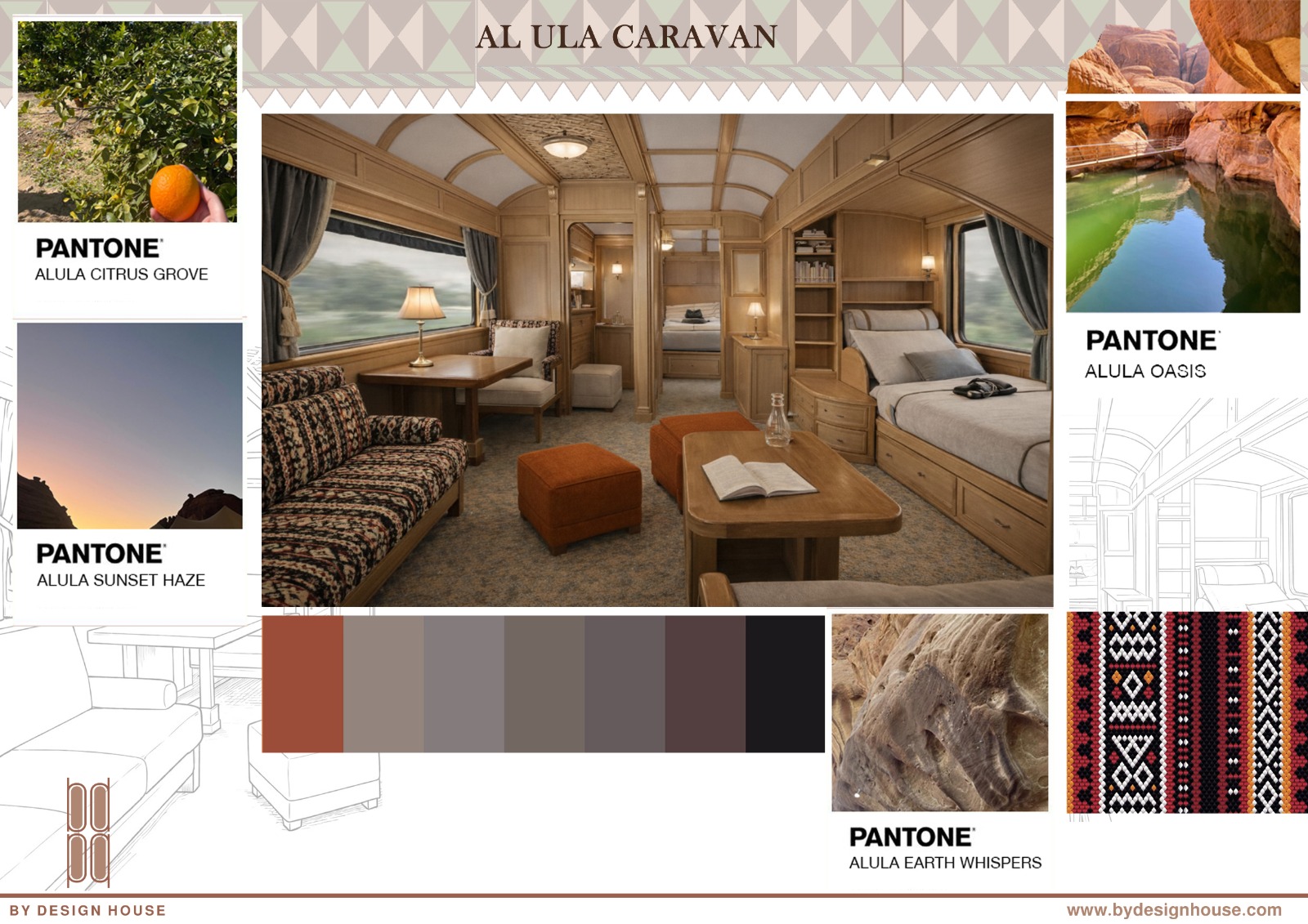 This caravan interior was designed as a warm retreat set within the landscape of AlUla, Saudi Arabia. Natural wood finishes, soft textiles, and a thoughtful layout create a calm and comfortable space inspired by the quiet beauty of the desert.