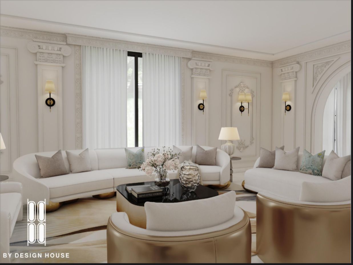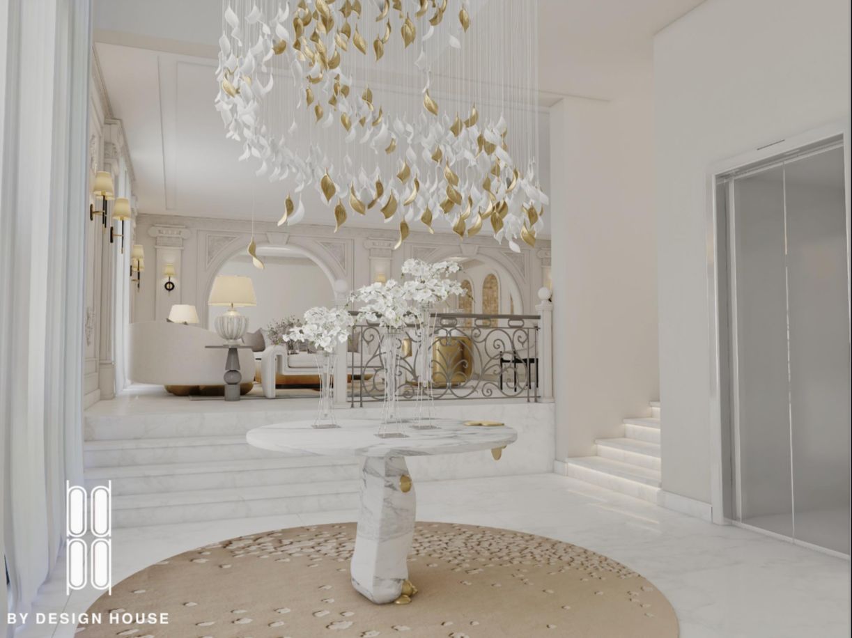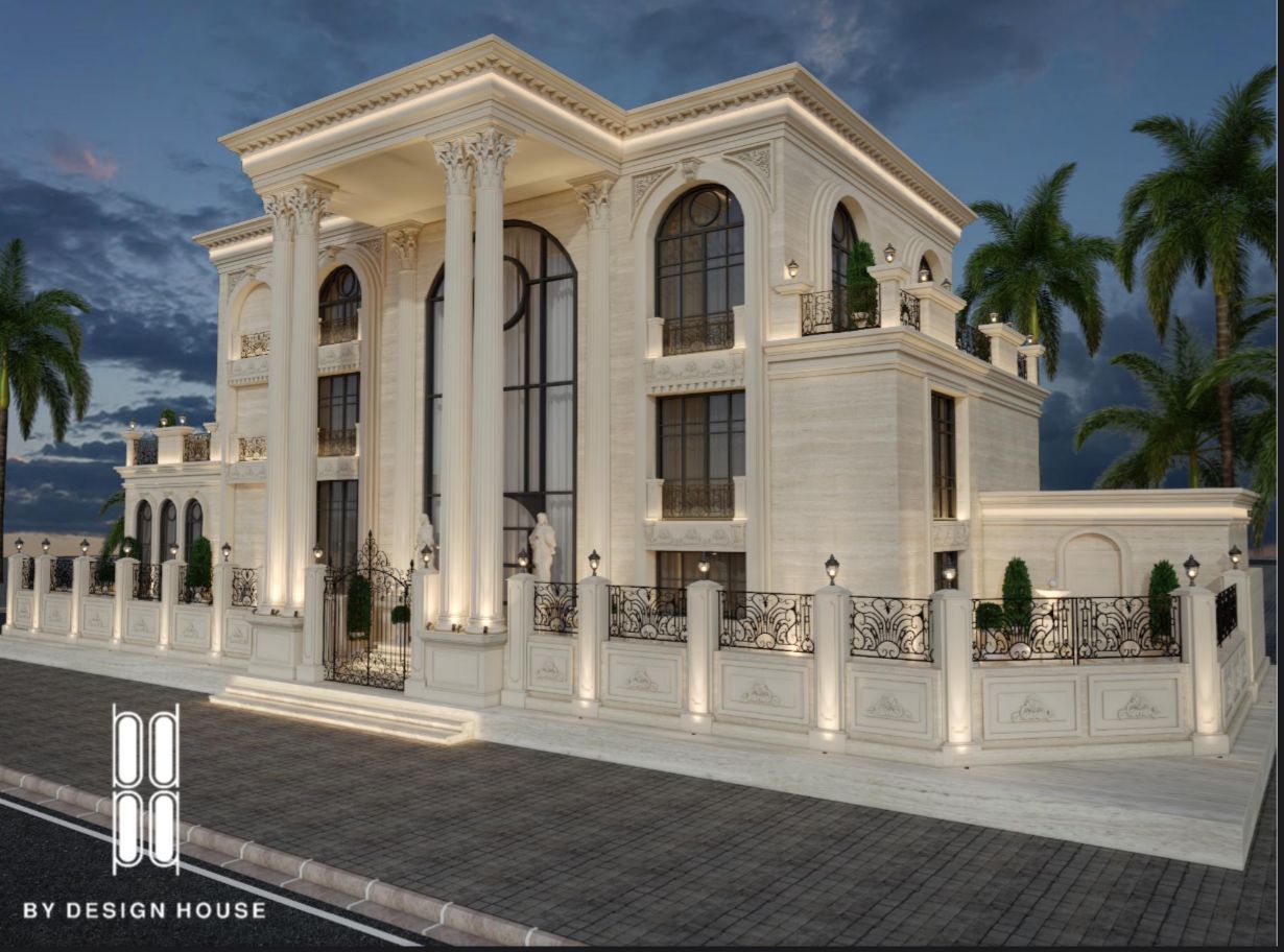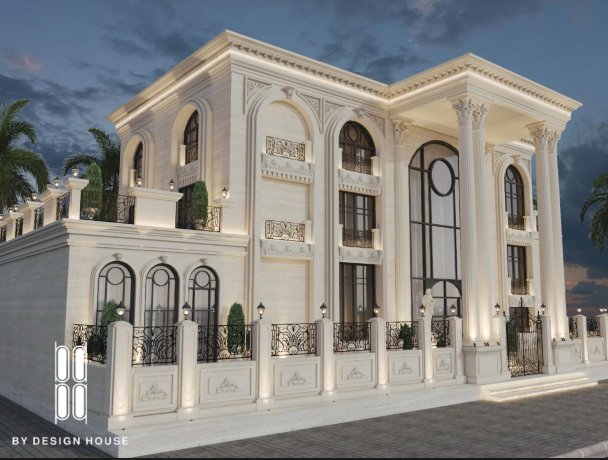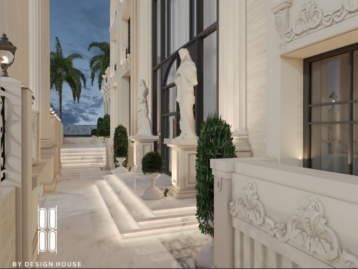A timeless classic villa that blends elegance and refined details, giving the entrance a distinguished presence. The design features Roman-inspired touches with ornate fence details and intricate architectural elements, where white and gold harmoniously merge to reflect exceptional sophistication. Every corner of this home tells a story of craftsmanship and creativity, bringing together classical character with luxury in a truly distinguished architectural masterpiece.