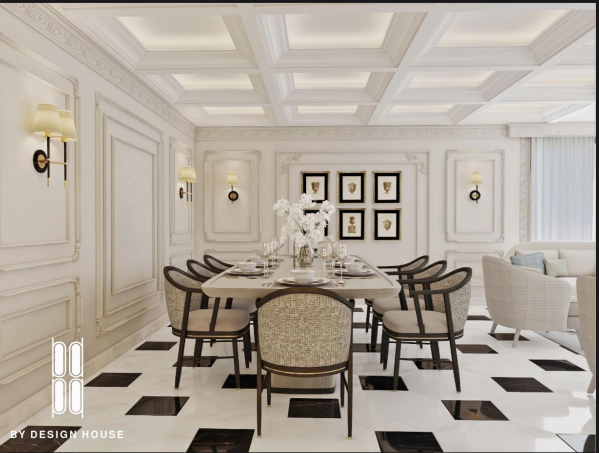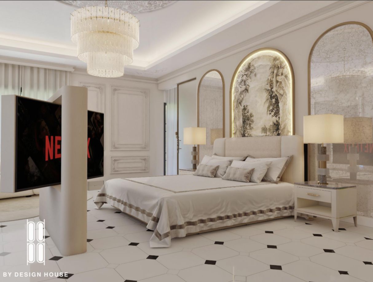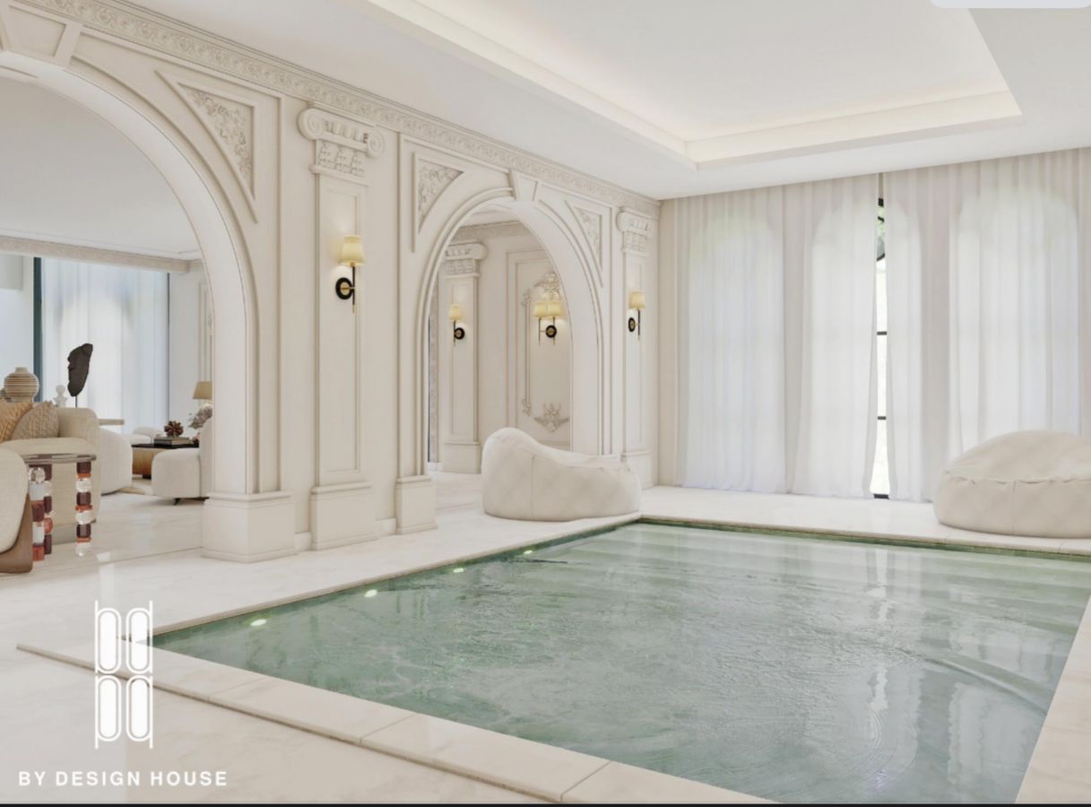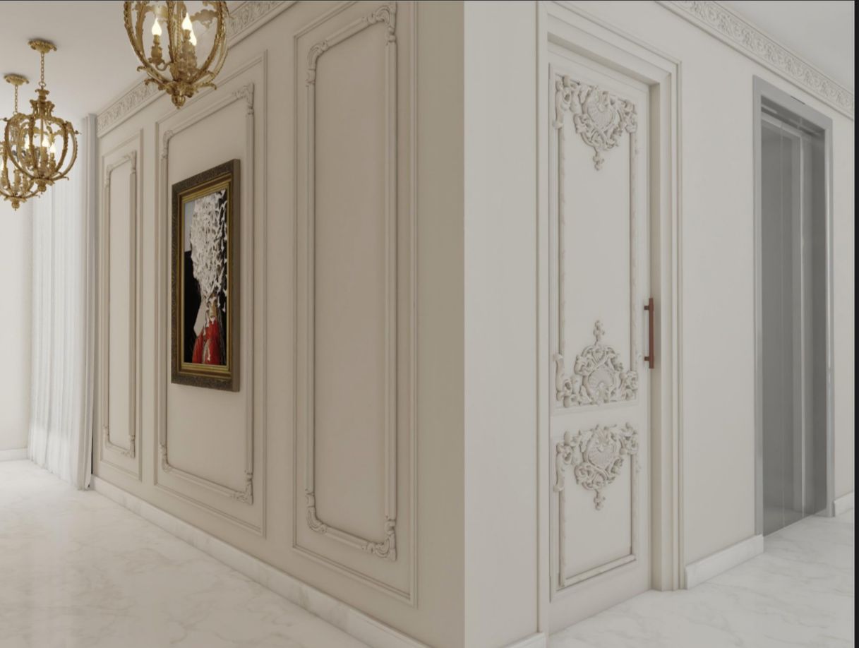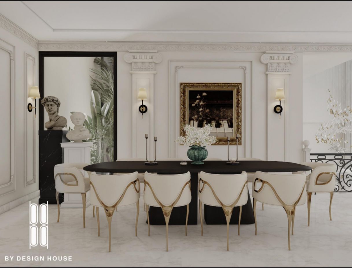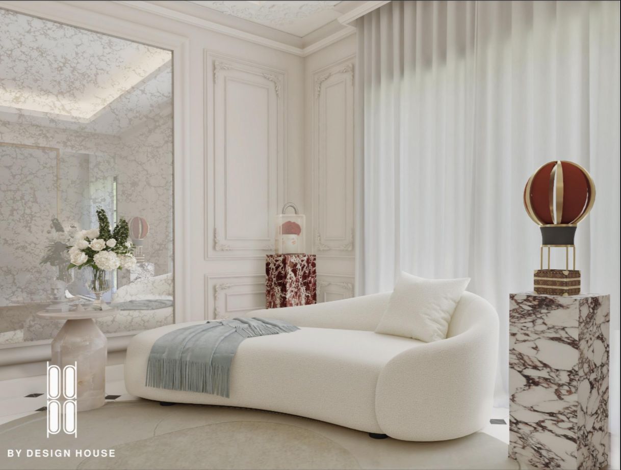A timeless classic villa that blends elegance and refined details, giving the entrance a distinguished presence. The design features Roman-inspired touches with ornate fence details and intricate architectural elements, where white and gold harmoniously merge to reflect exceptional sophistication. Every corner of this home tells a story of craftsmanship and creativity, bringing together classical character with luxury in a truly distinguished architectural masterpiece.