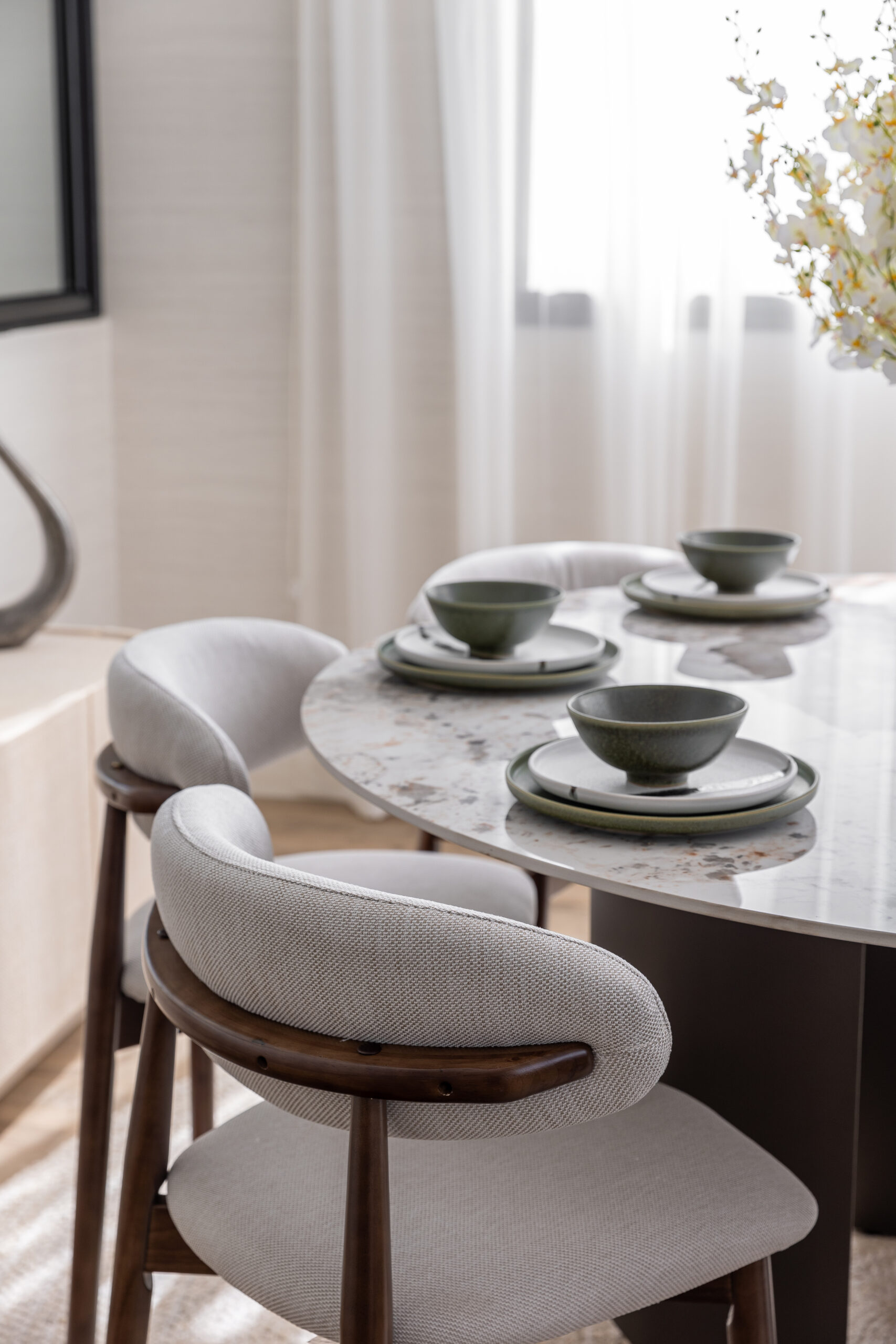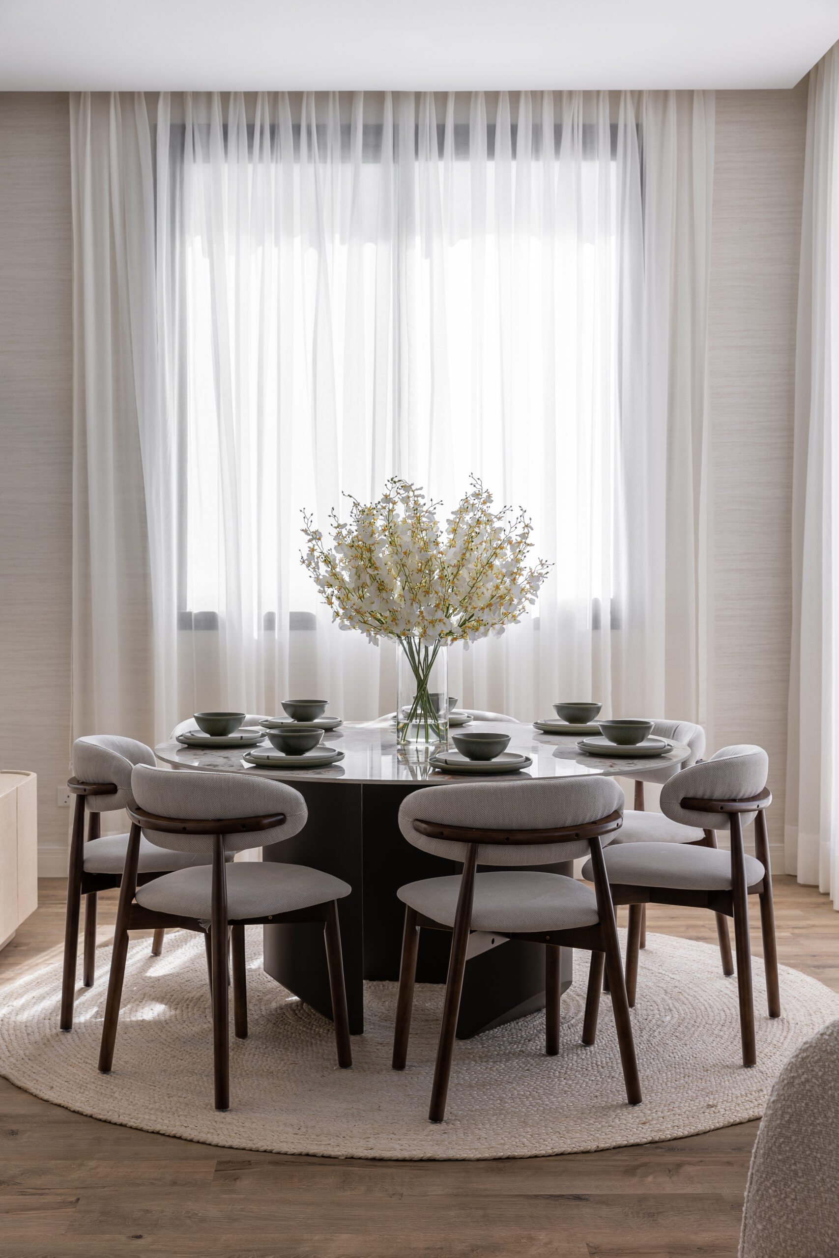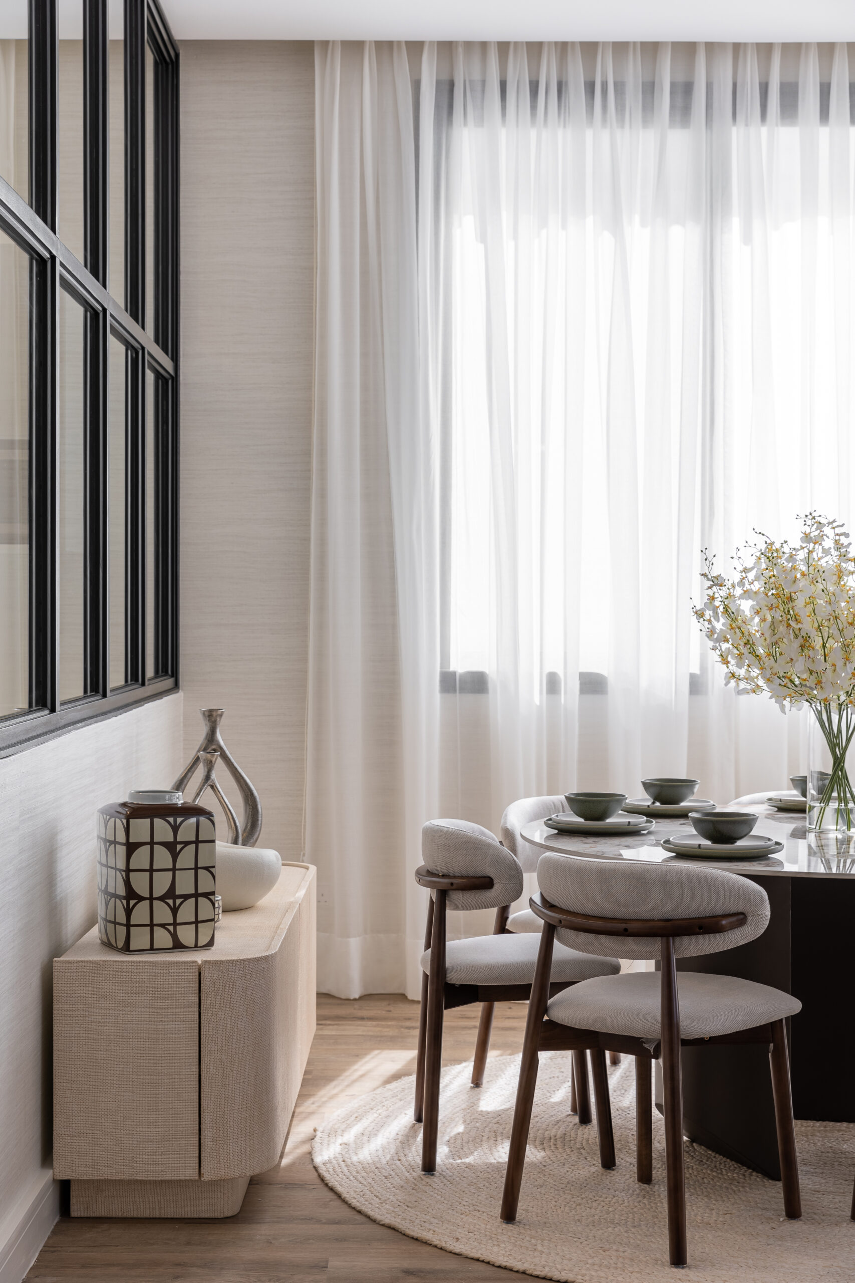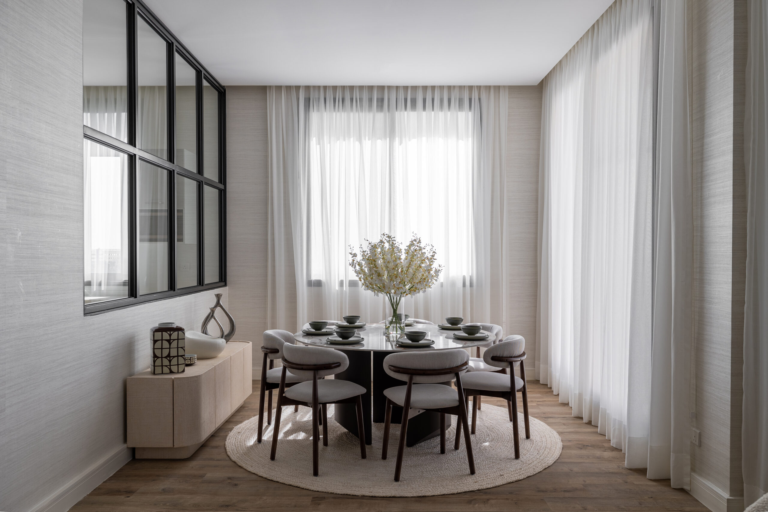 An open-plan living and dining space, where soft neutral tones meet rich textures. The warm wood flooring and minimal decor elements with furniture enhance the serene and modern sophistication of the interior. The spaces embrace natural light through flowing sheer curtains inviting flow clean lines.