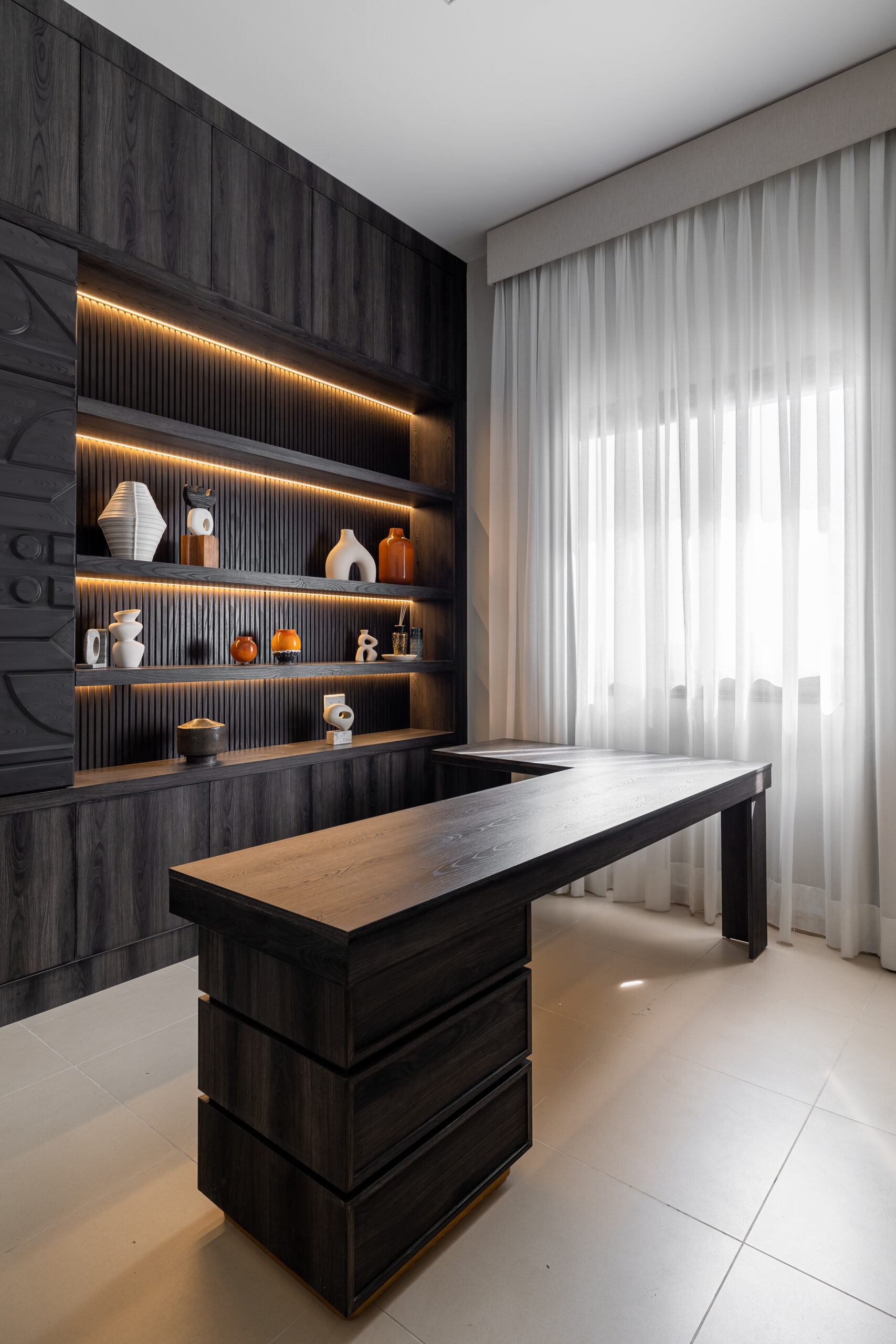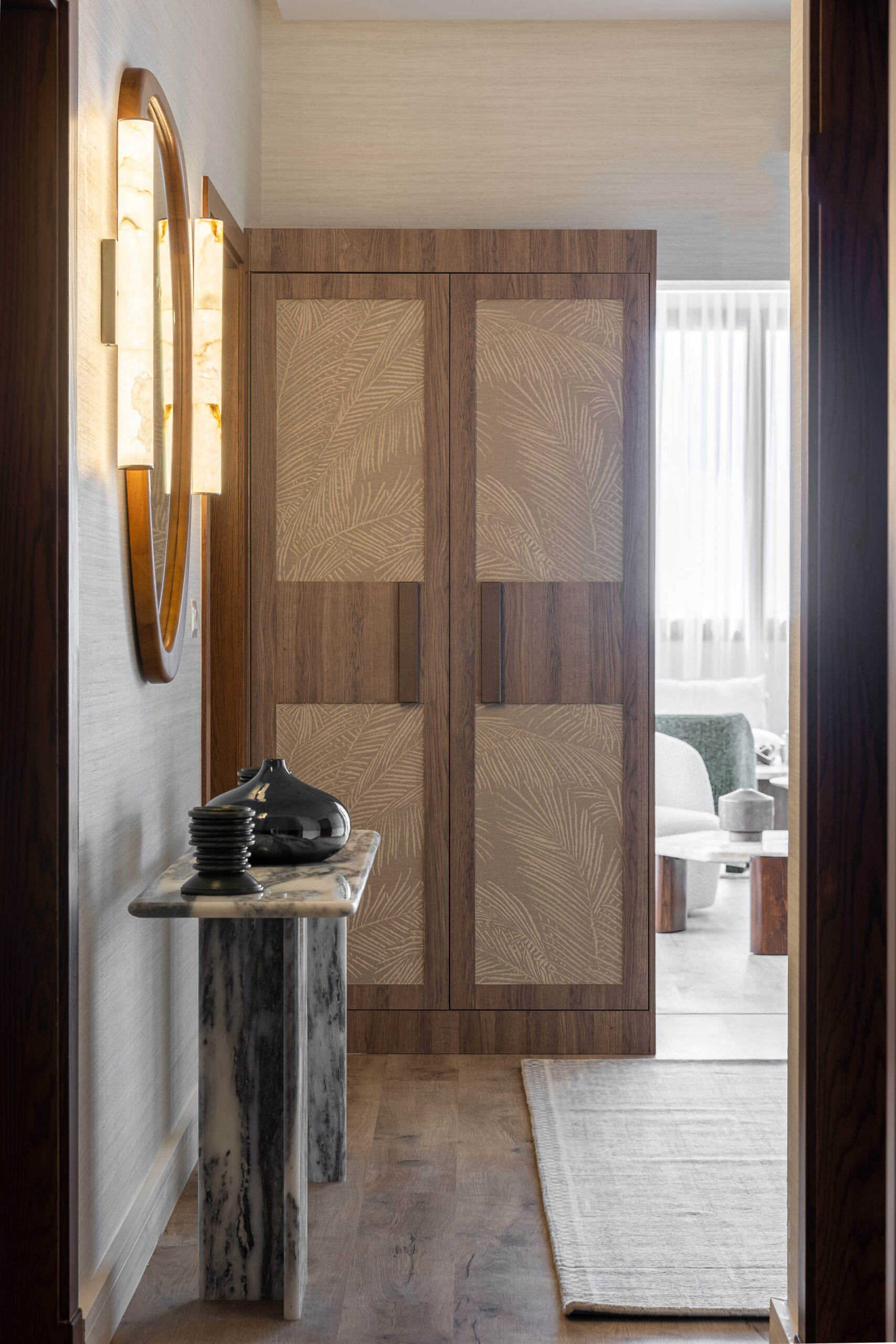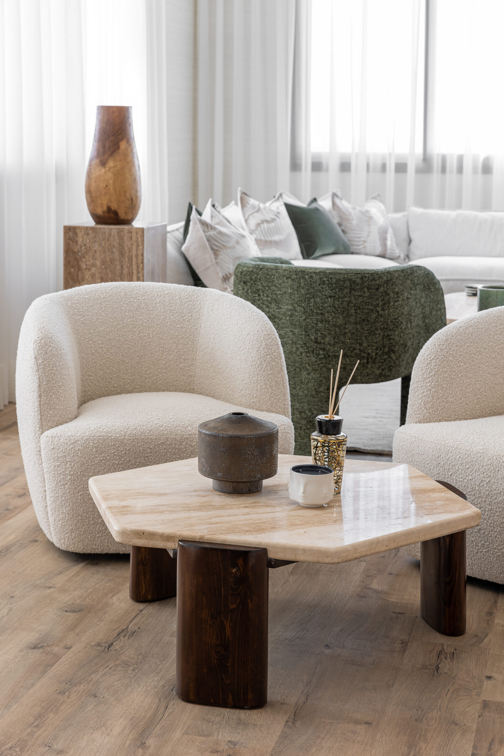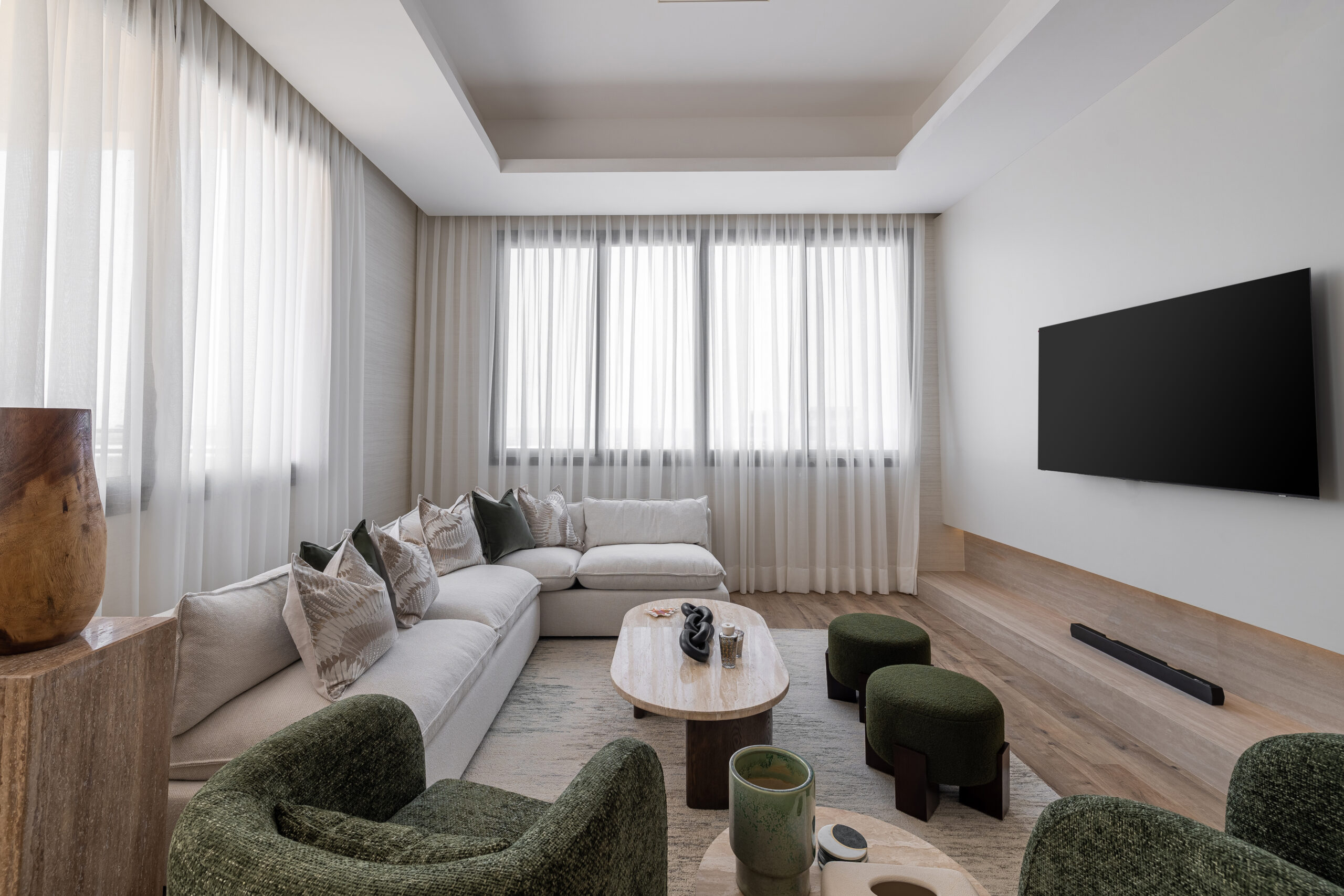 An open-plan living and dining space, where soft neutral tones meet rich textures. The warm wood flooring and minimal decor elements with furniture enhance the serene and modern sophistication of the interior. The spaces embrace natural light through flowing sheer curtains inviting flow clean lines.