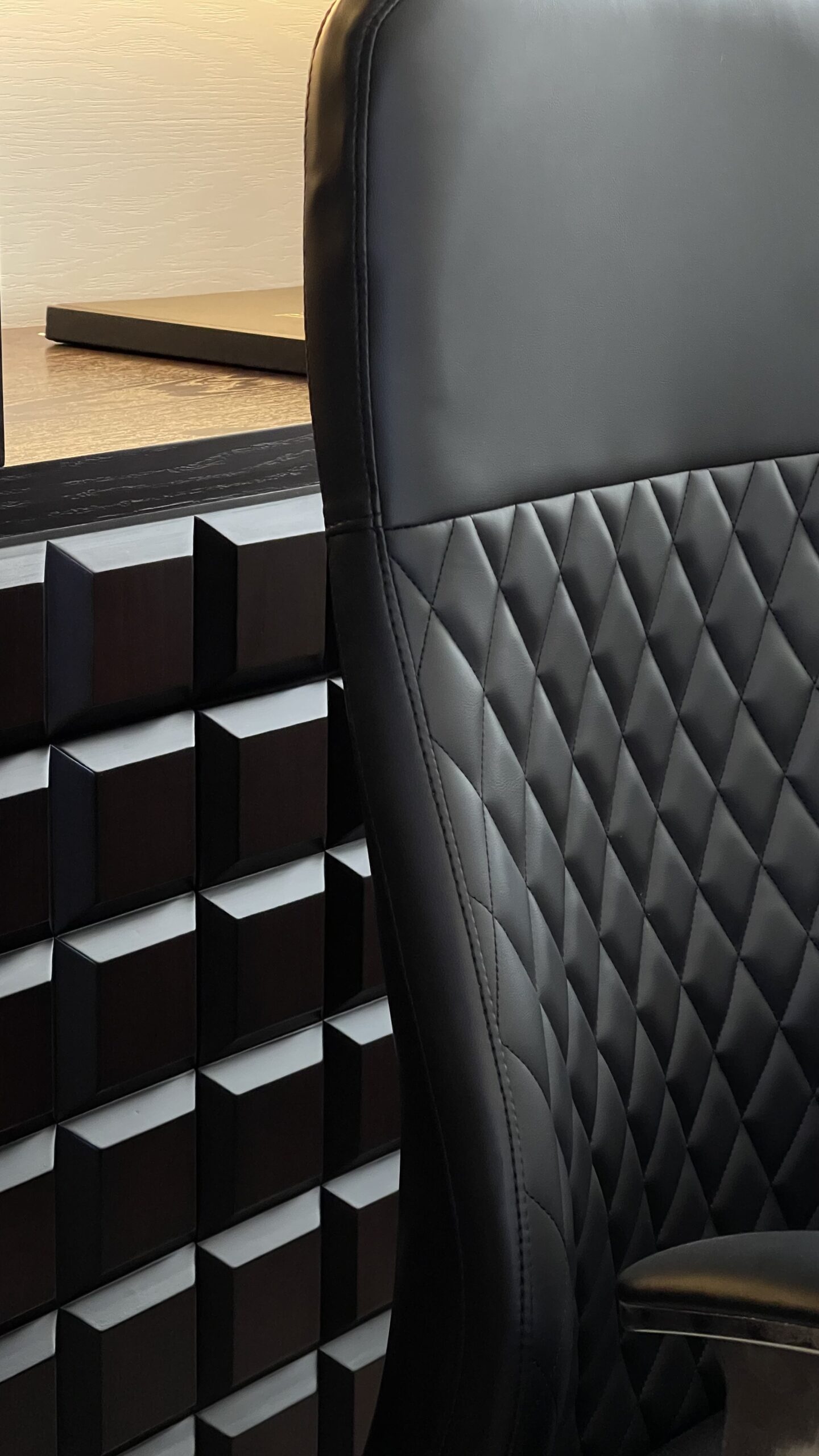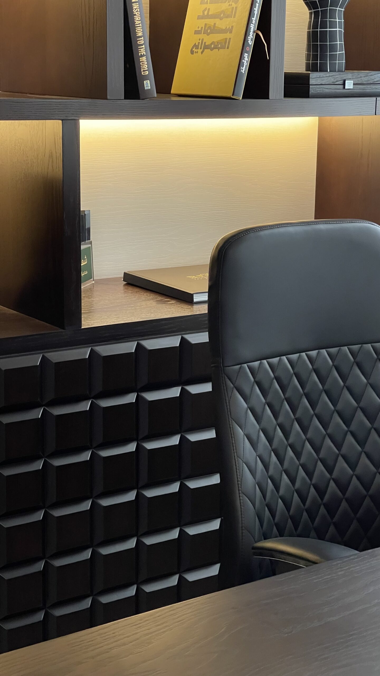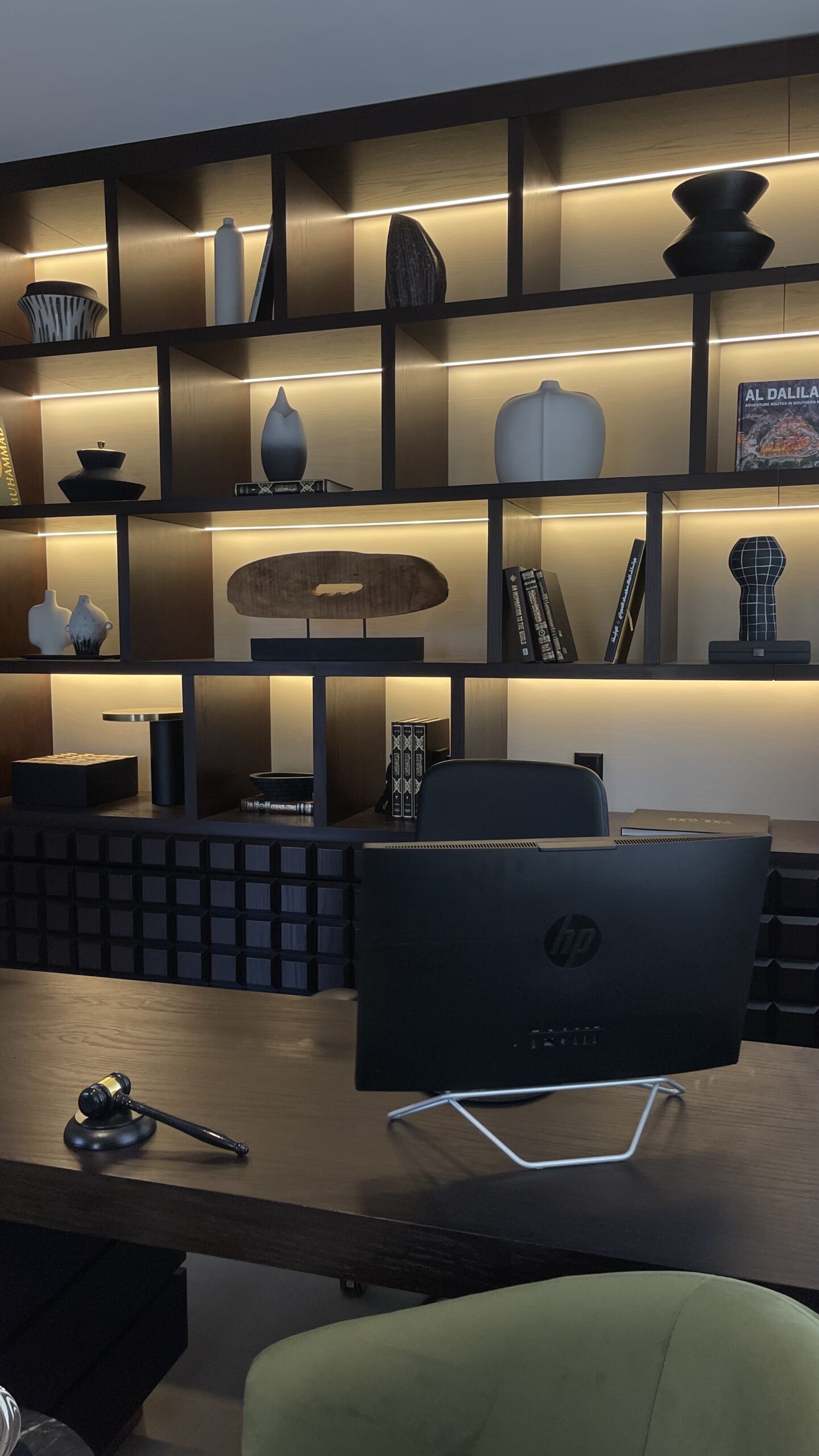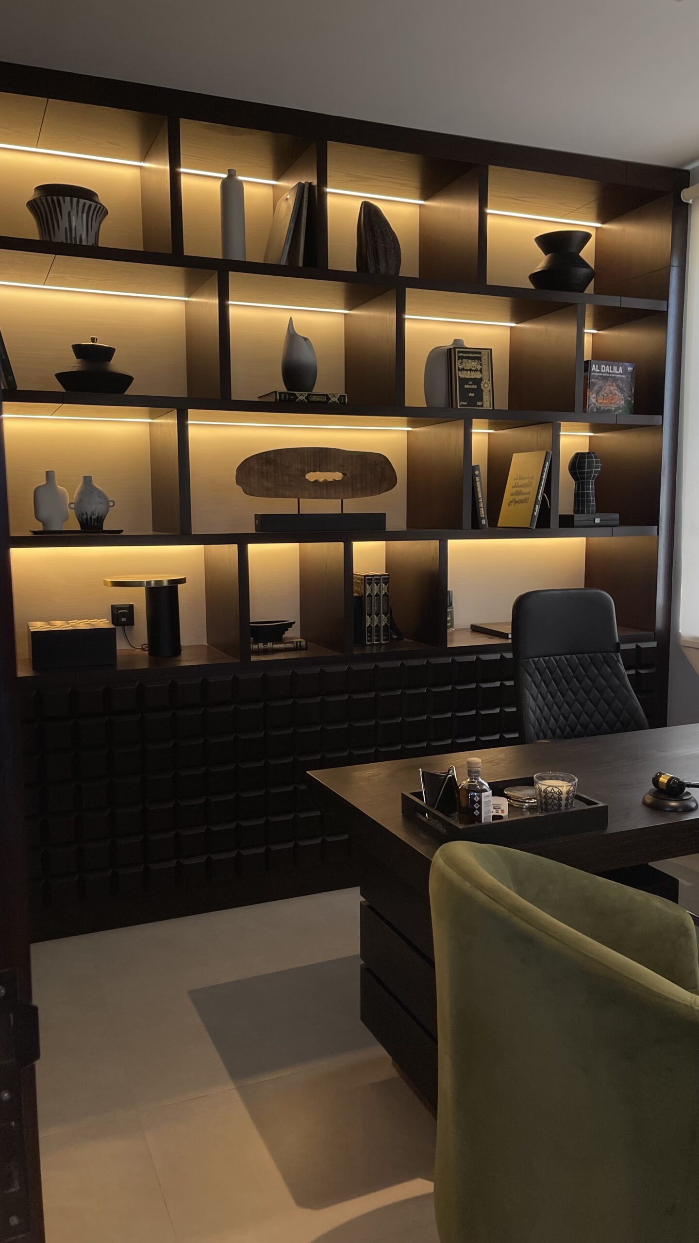 reusing existing furniture. Dark wood finishes, integrated LED lighting,