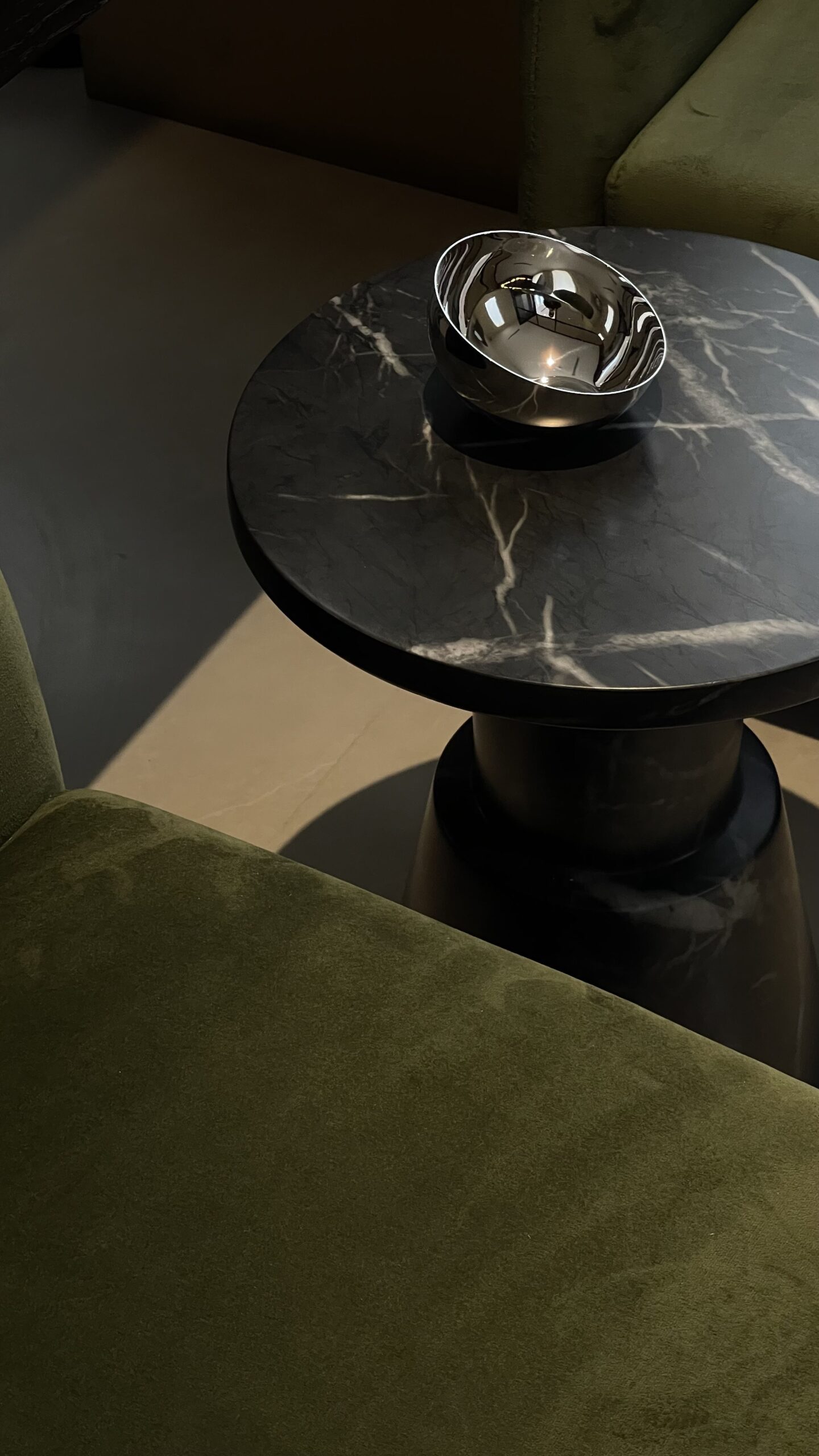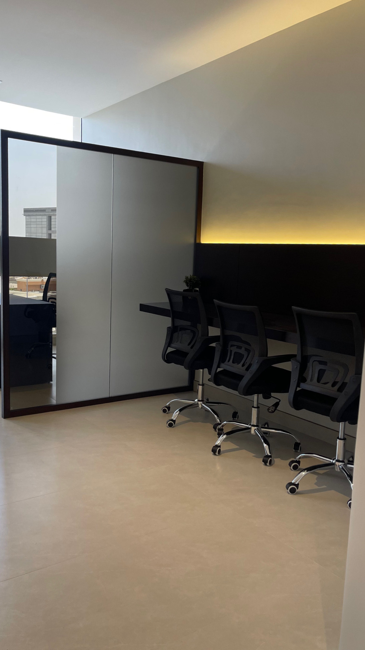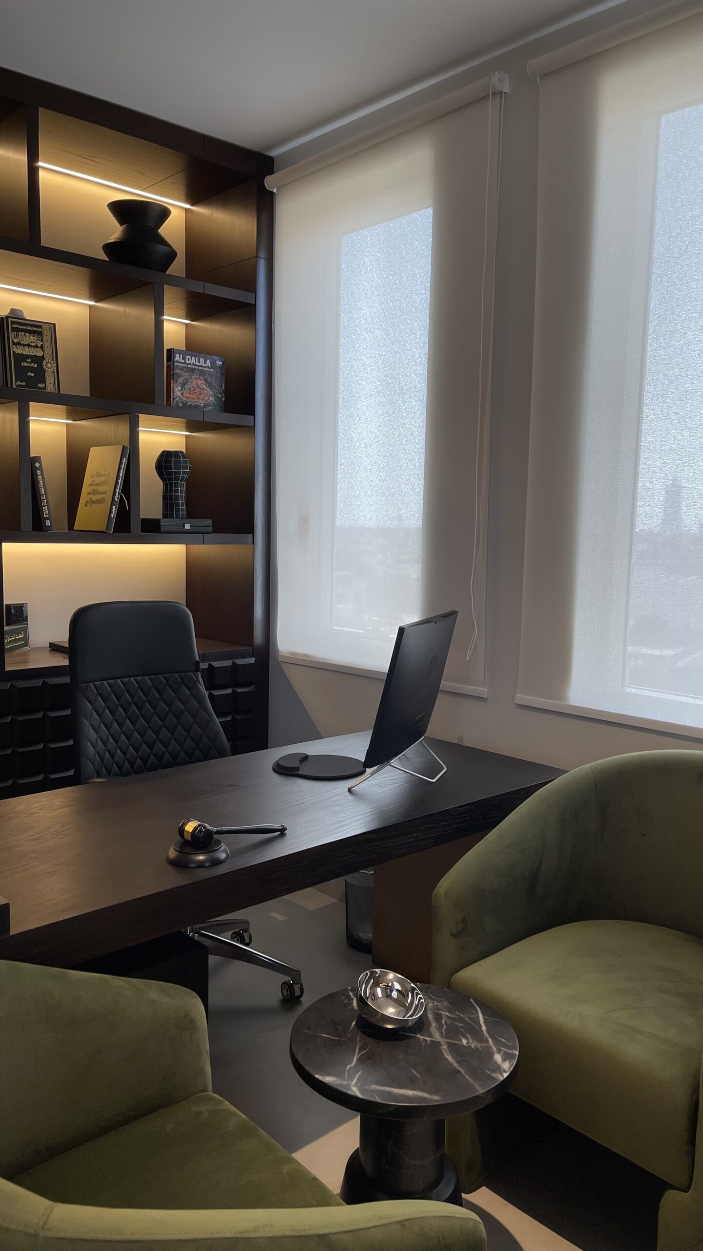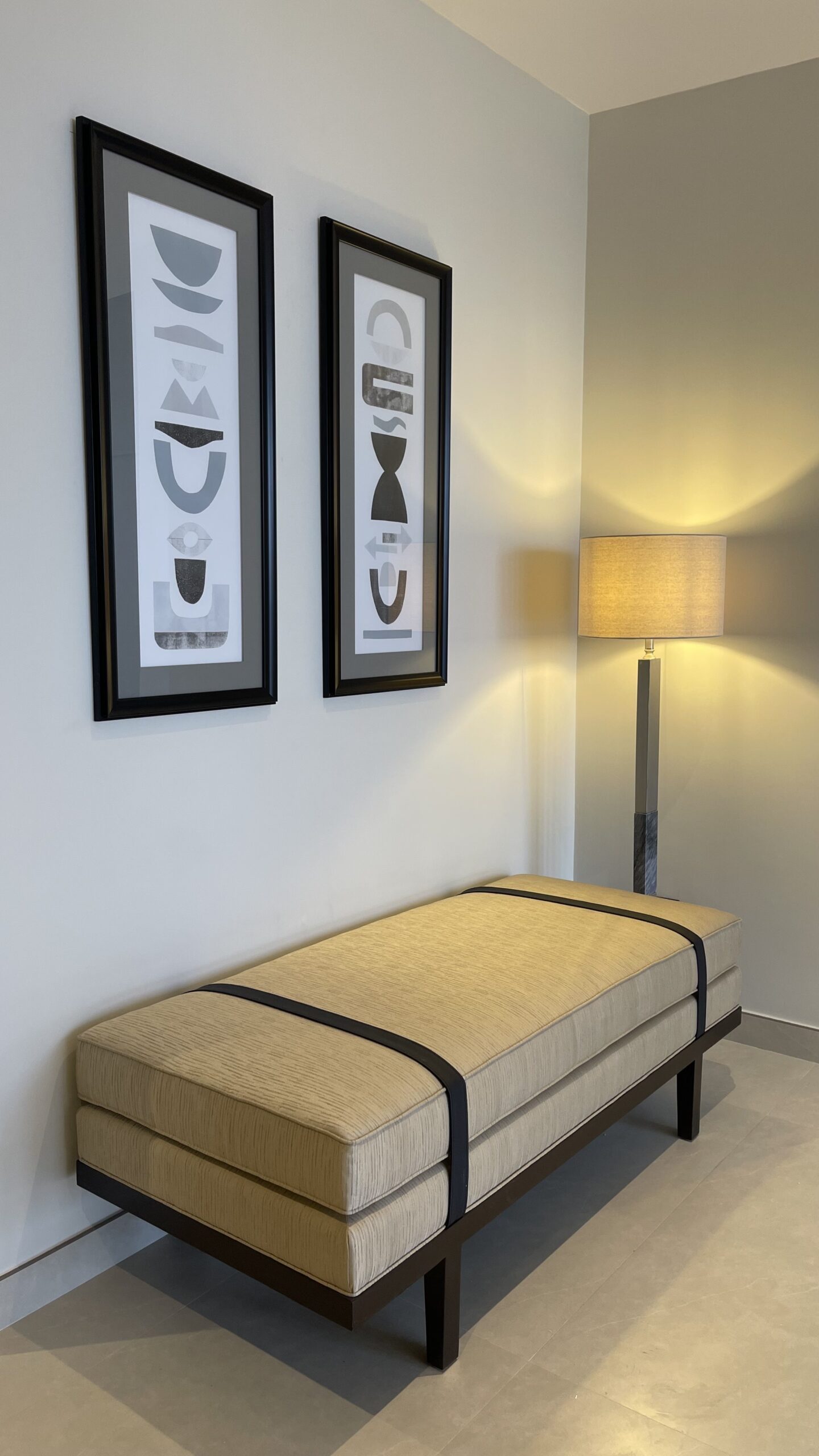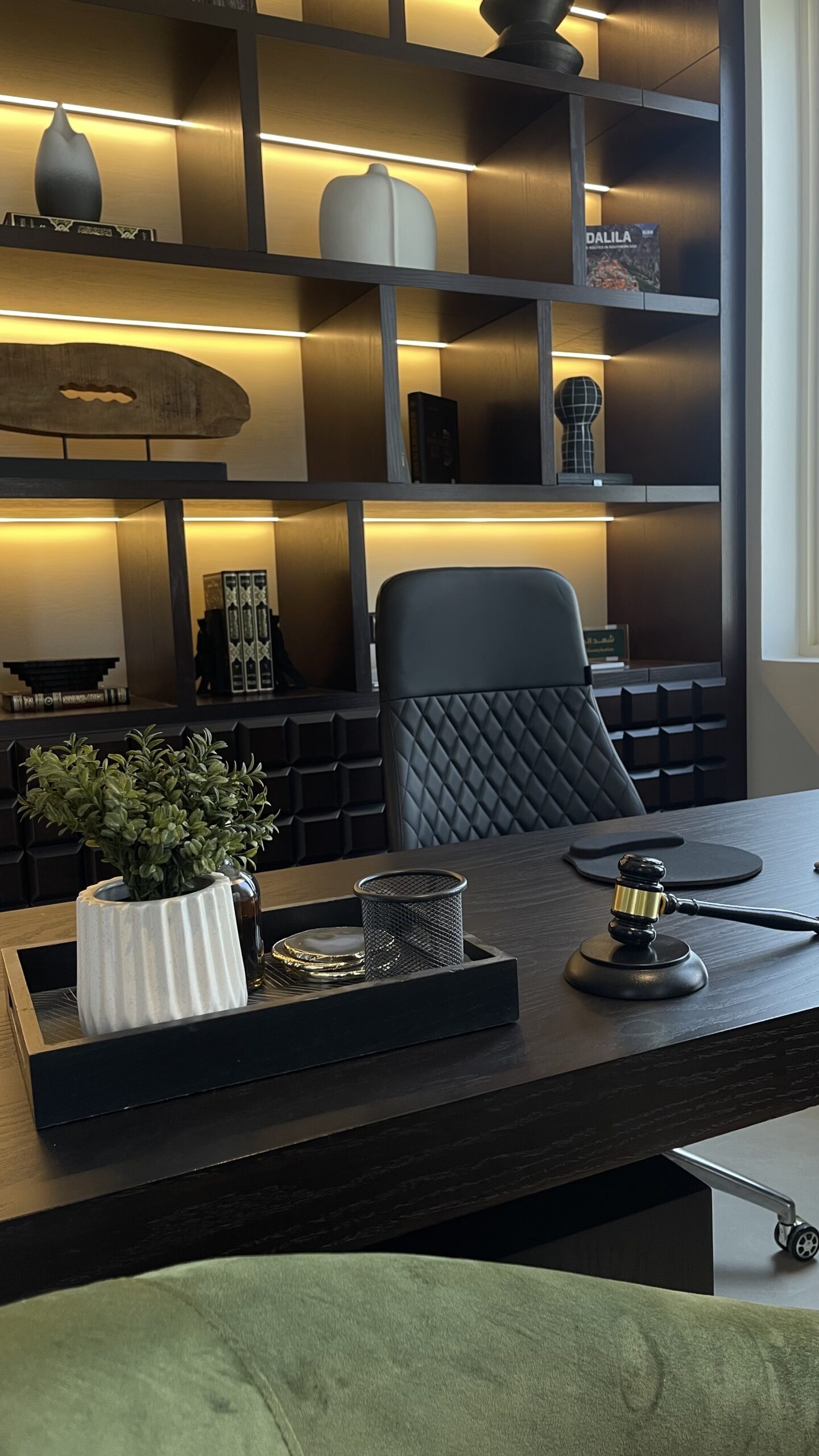 reusing existing furniture. Dark wood finishes, integrated LED lighting,