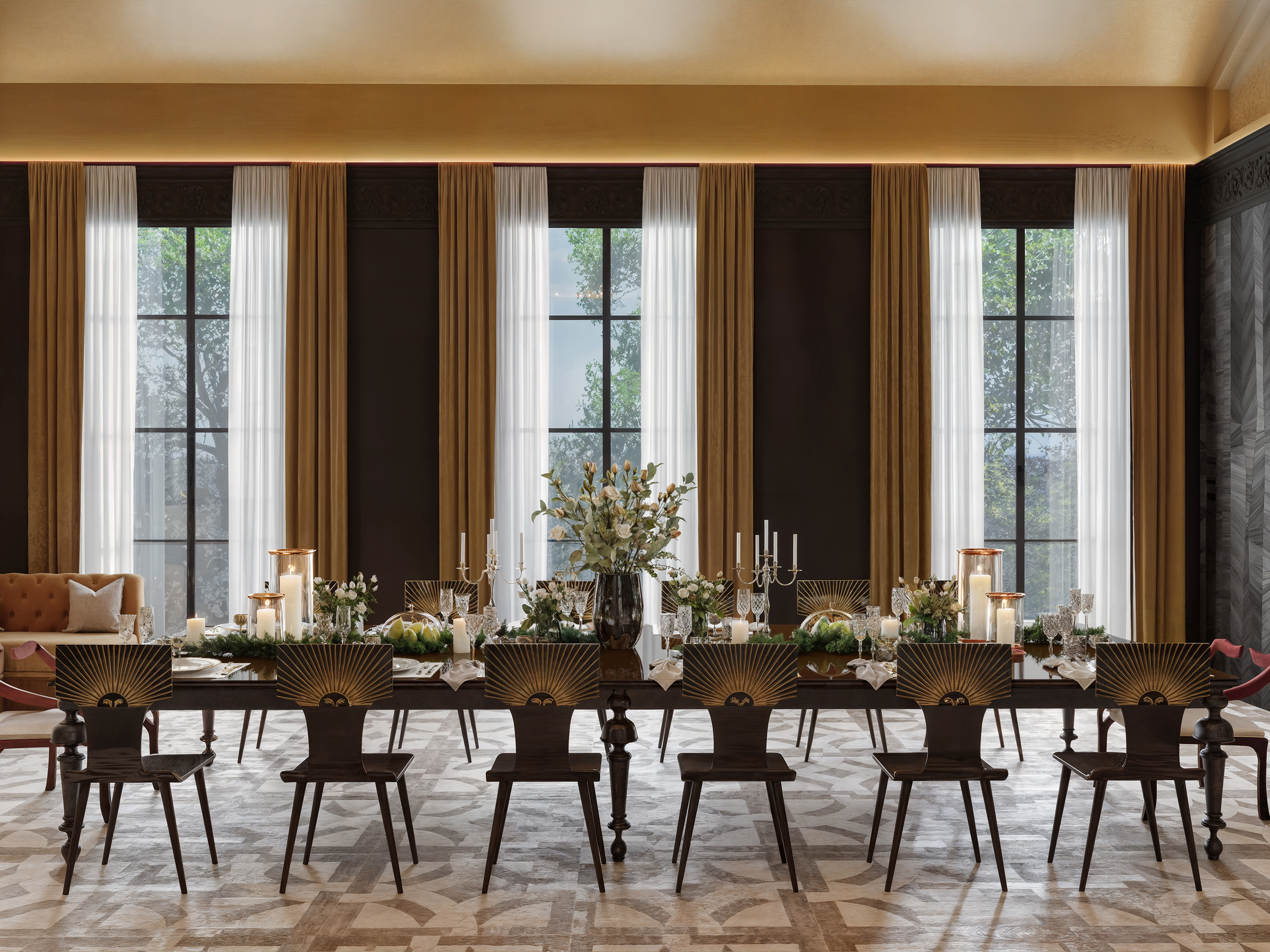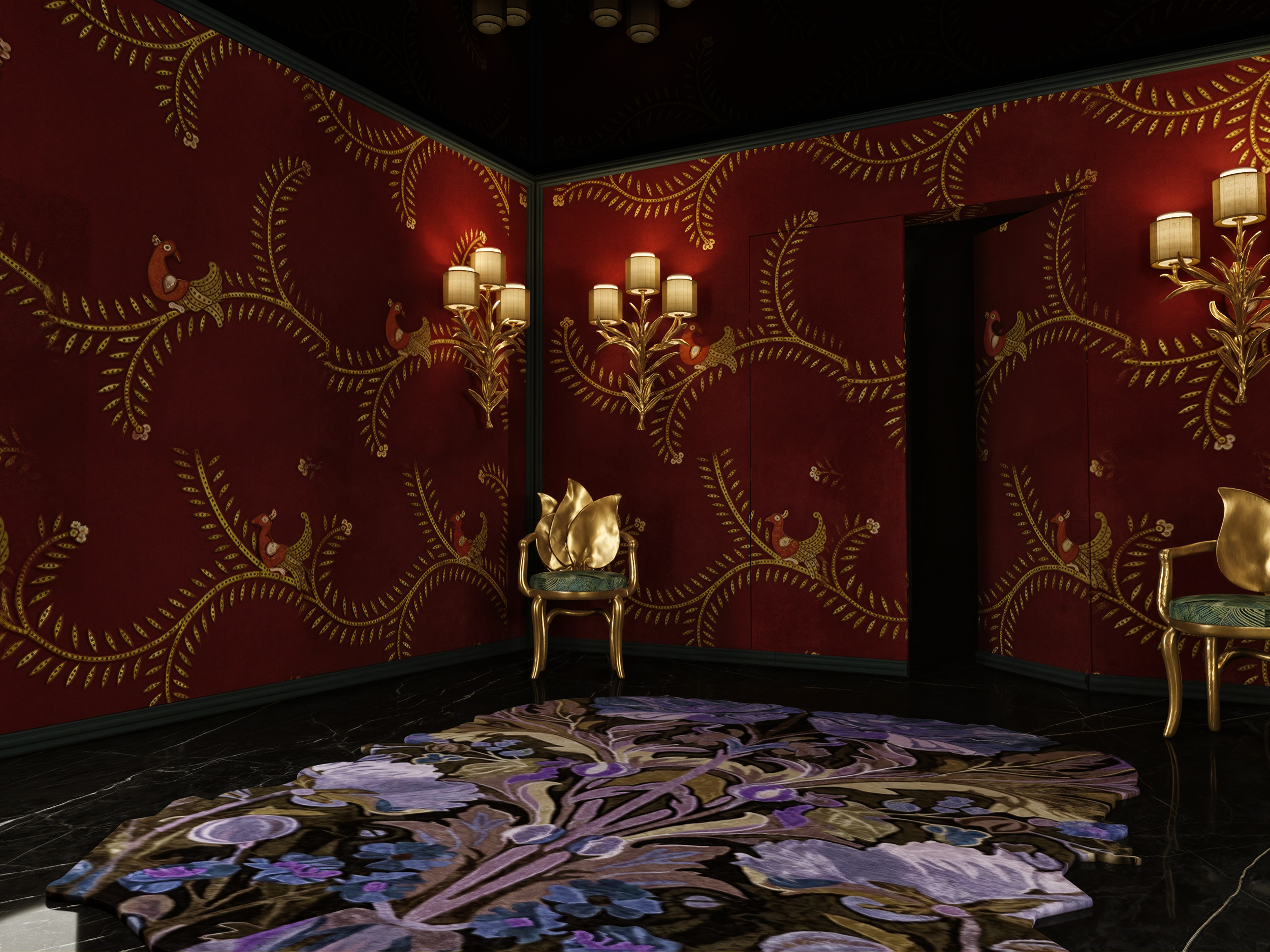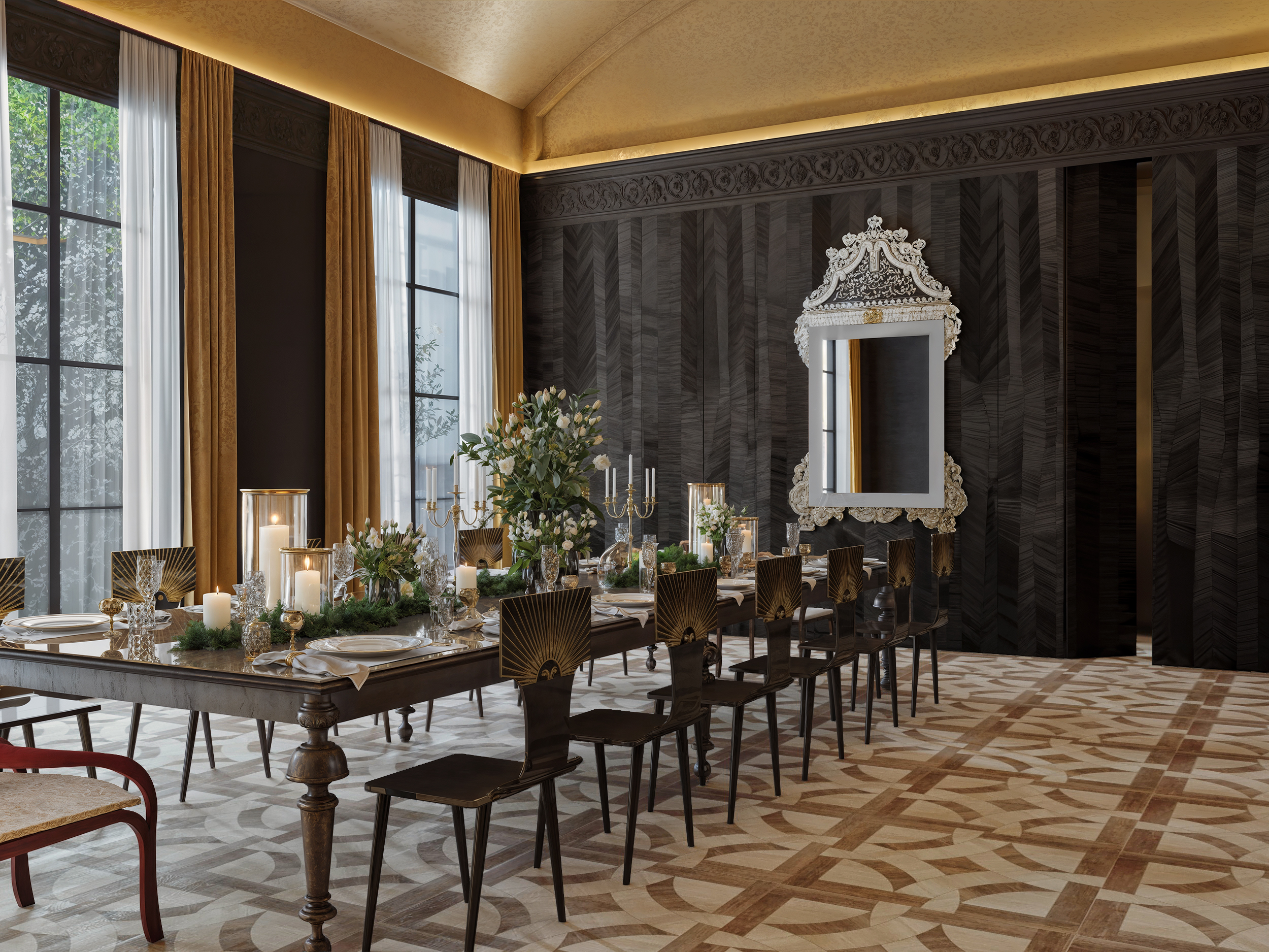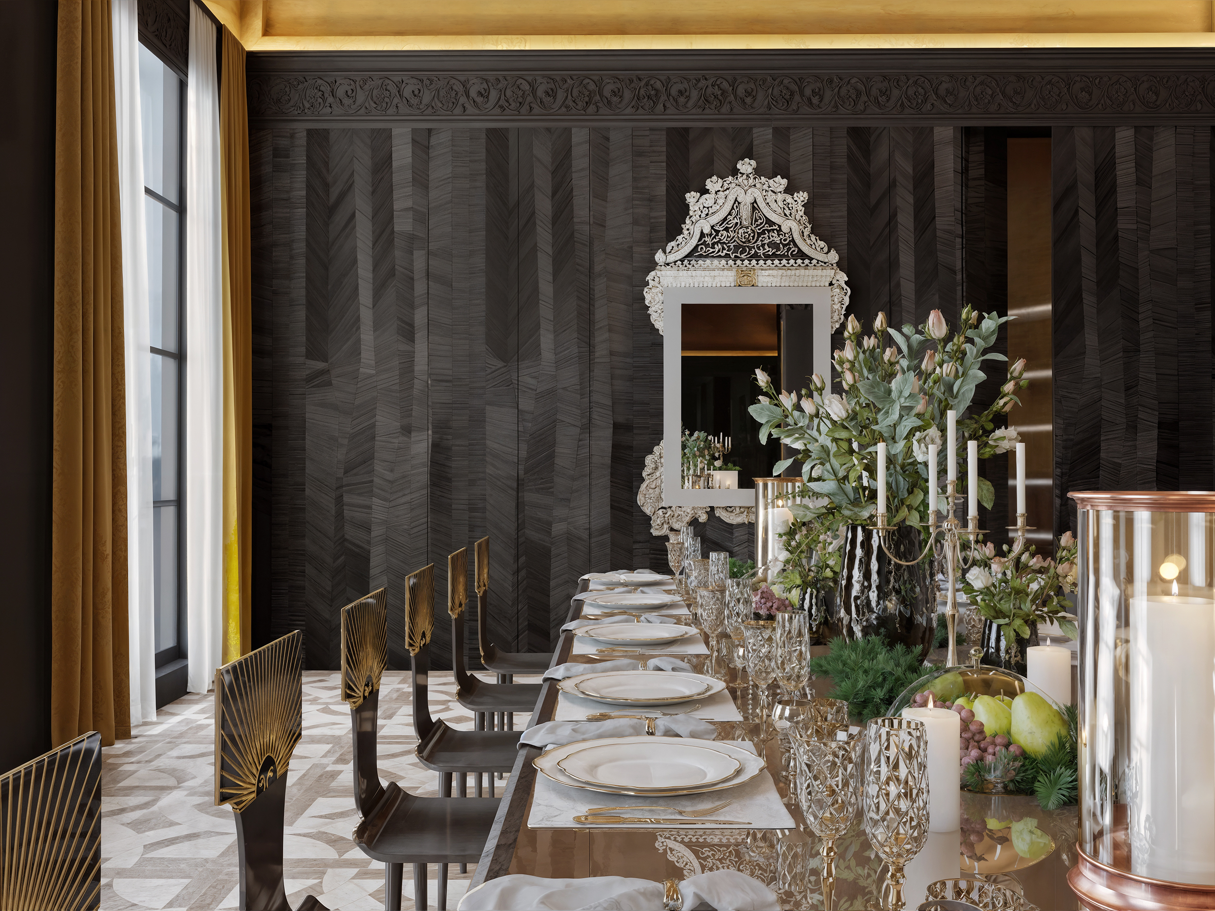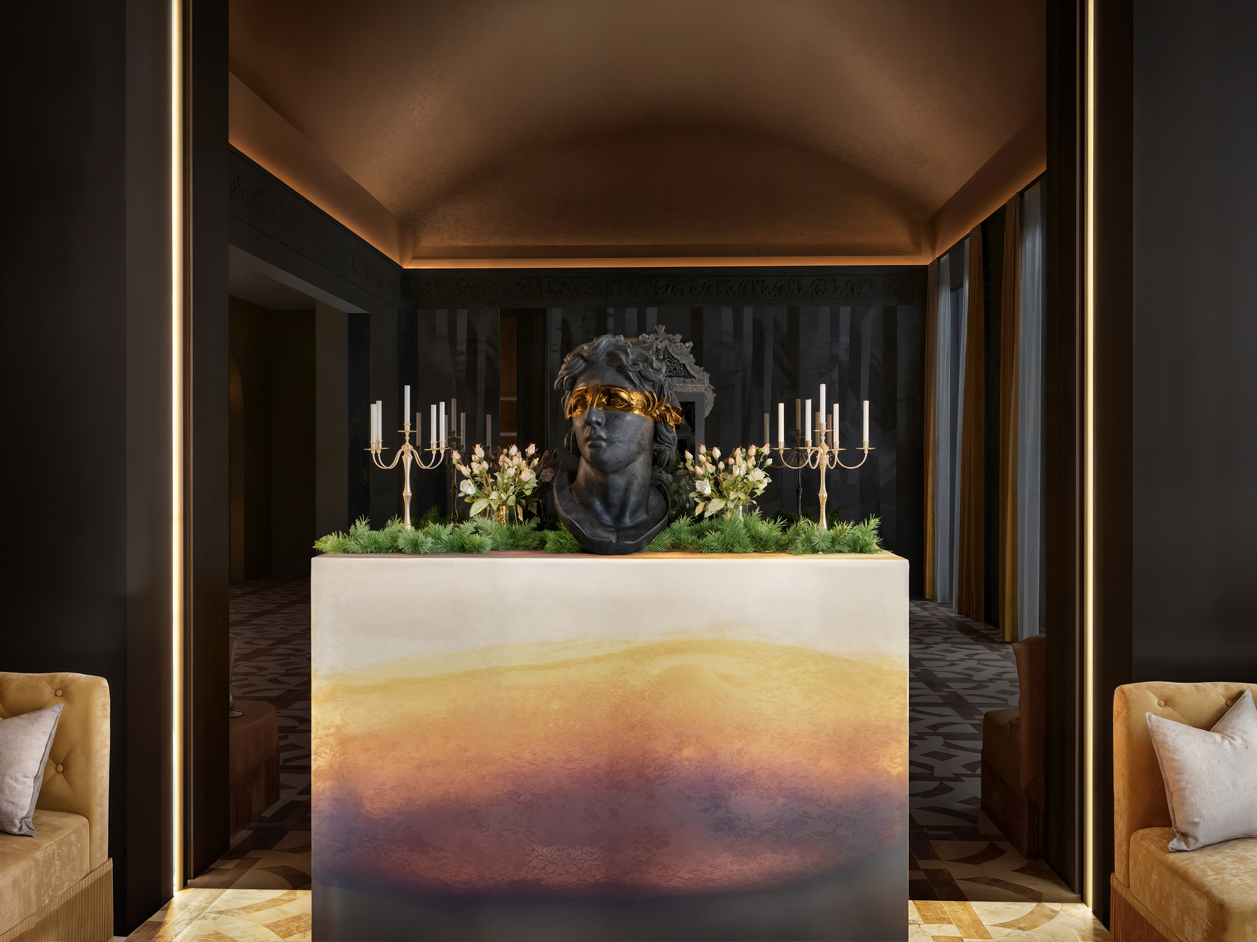 This residential project in Qatar was designed with a contemporary spirit infused with dramatic elegance. The combination of luxurious furniture, rich colours, and artistic details in the walls and lighting creates a unique ambiance that balances modernity with sophistication.